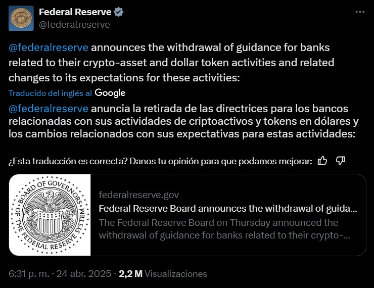 Recientemente, la Reserva Federal de EE. UU. (FED) anunció la eliminación de varias directrices que regulaban las actividades de los bancos relacionadas con criptoactivos. Según el organismo, el objetivo es actualizar la normativa frente a los nuevos riesgos y fomentar la innovación dentro del sistema financiero.