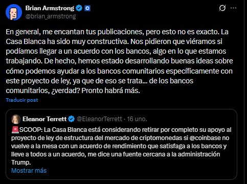 La afirmación viene de Brian Armstrong, CEO de Coinbase, quien rechazó informes de tensiones que frenarían la legislación sobre la estructura del mercado de los activos digitales en ese país.