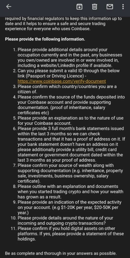 También compartió una imagen en donde se leen varios de los requisitos exigidos por Coinbase para comenzar a usar la plataforma. Las peticiones van desde dar detalles sobre la ocupación actual (y del pasado), certificados de salario, hasta informar si se tienen criptomonedas en otros monederos digitales.