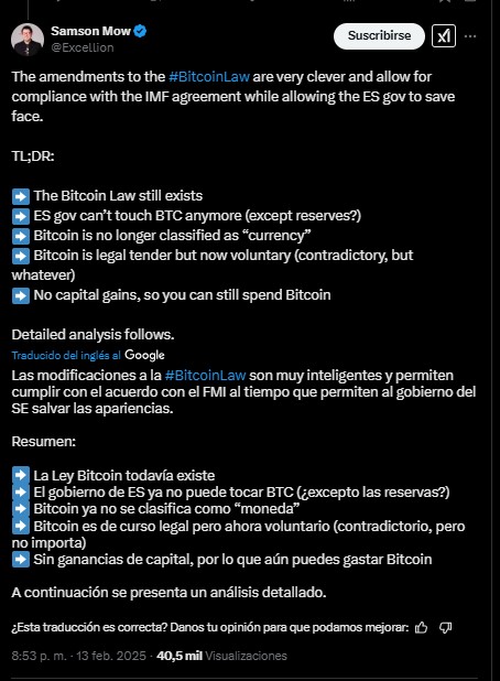 Los cambios, tal como los ve el CEO de la empresa JAN3, Samson Mow, presentan un panorama complejo que puede impactar en el uso práctico de bitcoin. Así que, analizando los cambios, Mow encuentra varias preguntas que aún están sin respuestas, como si realmente la moneda digital dejó de ser de curso legal en tierra salvadoreña o no.