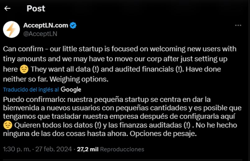 La start-up salvadoreรฑa AcceptLN.com, que agiliza los pagos con bitcoin en ese paรญs, confirmรณ que el gobierno de El Salvador quiere acceder a todos los datos y las finanzas auditadas de la compaรฑรญa. Lo que les ha llevado a pensar en establecerse fuera del paรญs.