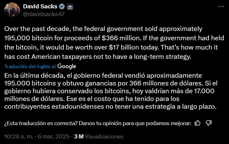 Este cambio de enfoque contrasta con la estrategia adoptada por el gobierno estadounidense en la última década. Tal y como recordó recientemente David Sacks, el «zar de la IA y criptomonedas» designado por Donald Trump, durante ese período las autoridades vendieron aproximadamente 195.000 bitcoins por apenas USD 366 millones. De haberlos conservado, hoy valdrían más de USD 17.000 millones.