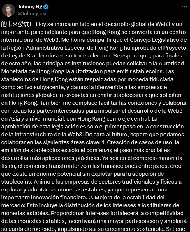 Johnny Ng, quien forma parte del Consejo Legislativo de Hong Kong, ha considerado que la aprobación de esta ley en Hong Kong es vital para que la región se afiance como líder en innovación, como muestra el siguiente mensaje que publicó en X: