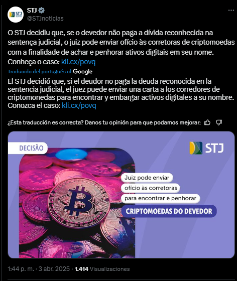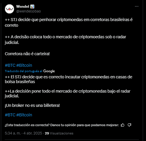 En todo caso, la decisiรณn del STJ ha encendido las alarmas en la comunidad brasileรฑa que gira en torno a bitcoin, y las reacciones no se han hecho esperar. En X, un usuario anรณnimo advirtiรณ: