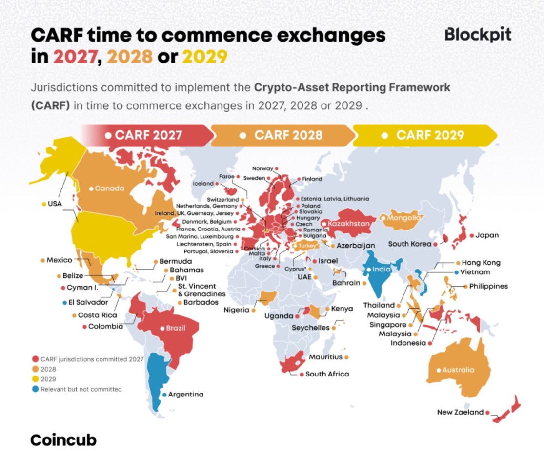 Un mapa detallado sobre la implementación del CARF revela que la presión regulatoria no es uniforme en su calendario, pero sí en su alcance. Países como Canadá, Brasil, gran parte de Europa, Sudáfrica y Australia se han comprometido a iniciar estos intercambios informativos en 2027.