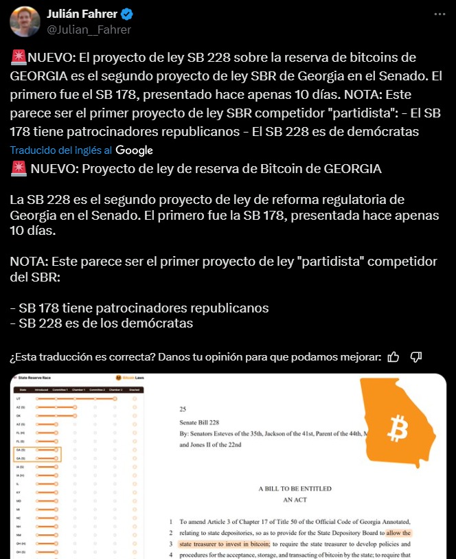 Diez días después de presentar un primer proyecto de ley para crear una tesorería basada en bitcoin, el estado de Georgia ha presentado una segunda iniciativa. A diferencia de la anterior, SB 178, que imponía restricciones a la inversión, el nuevo proyecto, SB 228, permite invertir en BTC sin límites. La propuesta, impulsada por congresistas demócratas, ahora competirá con la versión republicana.