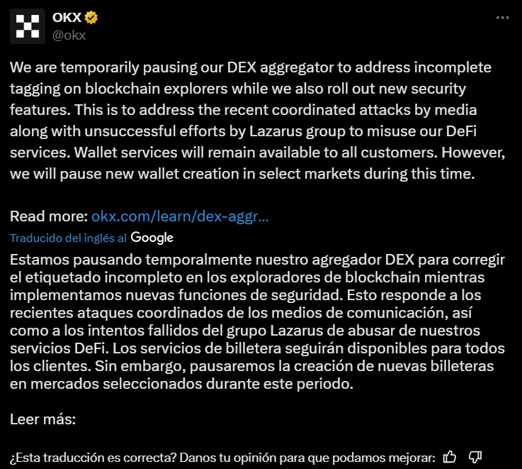 Días después de que se informara sobre una posible investigación por parte de la Unión Europea, OKX suspendió su servicio descentralizado. En una reciente publicación, la plataforma reconoció un «esfuerzo coordinado» por parte del grupo Lazarus para aprovechar indebidamente sus soluciones DeFi. Desde la empresa explican que están tomando esta medida para implementar mejoras adicionales en la plataforma y prevenir su uso indebido.