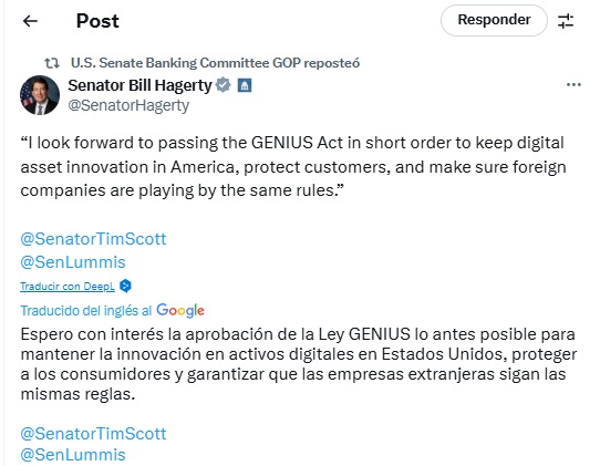 En medio de este escenario, el senador BIll Hagerty, uno de los proponentes de GENIUS, insta a sus colegas a seguir adelante de buena fe y manifiesta su confianza en la aprobaciรณn de GENIUS.