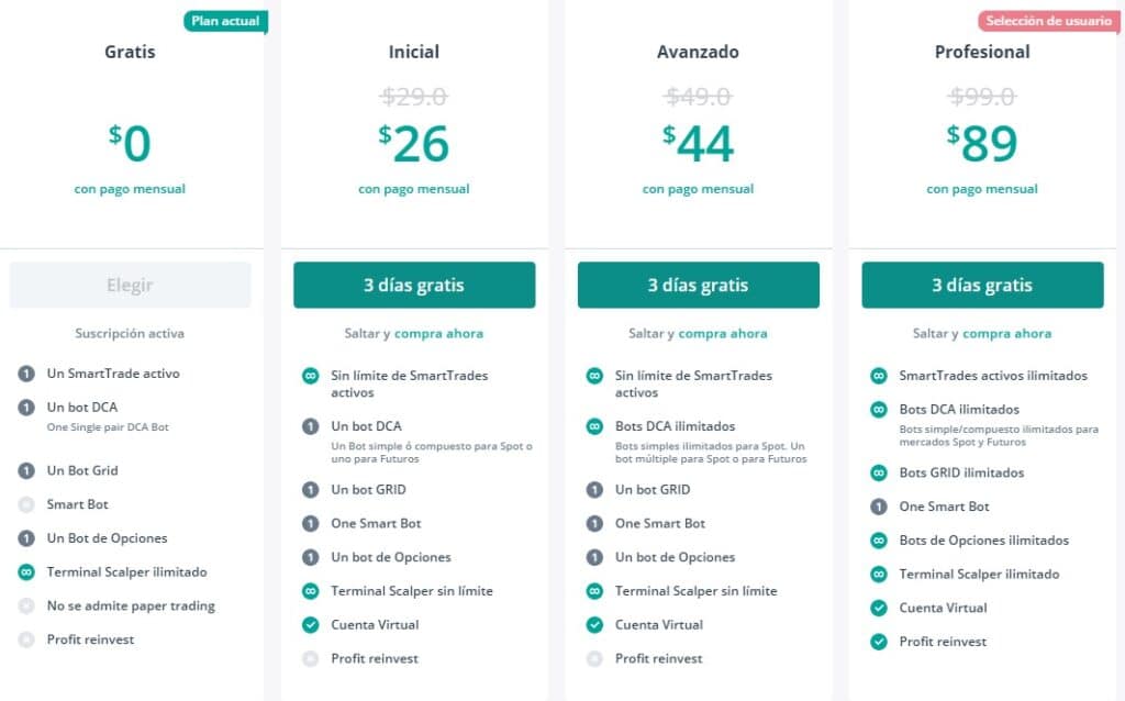 Los precios de 3commas están dentro del mercado. Los planes avanzados y profesional resultan anualmente un poco más económicos que los planes equivalentes ofrecidos por una plataforma como CryptoHopper, que pertenece a un nicho similar. Plataformas de trading automatizado como Shrimpy o TradeSanta, por otro lado, resultan algo más económicos, ofreciendo planes básicos por el orden de los USD 15 y avanzados por el orden de los USD 40.