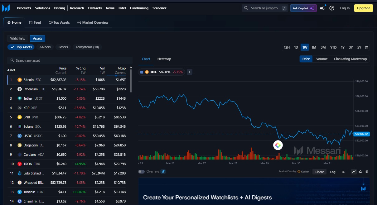 Messari es una plataforma de análisis e investigación enfocada en proporcionar datos estructurados y reportes de alta calidad sobre el mercado de criptomonedas.
