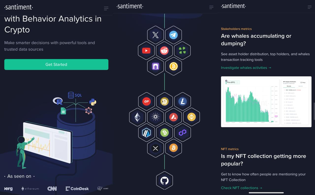 Santiment es una plataforma que combina métricas on-chain, indicadores de comportamiento social y análisis del sentimiento del mercado para ofrecer una visión completa de las tendencias.