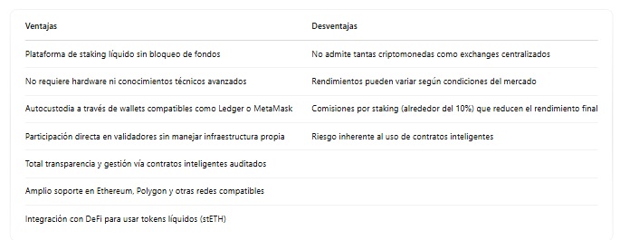 Esta es una plataforma de autocustodia. Funciona mediante un sistema de validadores distribuidos y contratos inteligentes auditados por firmas como Sigma Prime y Quantstamp. Además, está gobernada por una DAO (organización autónoma descentralizada), donde la comunidad vota sobre decisiones clave.