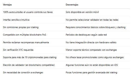 Su sistema permite hacer staking directamente desde la app, sin necesidad de usar DApps o integraciones externas y es compatible con más de 70 redes, incluyendo Ethereum, Binance Smart Chain, Solana, Tron, Tezos, Cosmos, entre otras.
