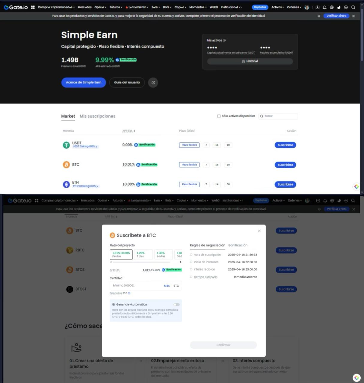 Gate.io destaca por tener amplias gamas de opciones de staking y ahorro del mercado. Ofrece diversos tipos de producto (flexible y plazo fijo o fixed-term), el cual va a determinar el proceso de retiro. En el plazo flexible los APR suelen ser más bajos, pero ofrecen liquidez inmediata y pueden ir desde 2.5% hasta 6.5%, dependiendo de la moneda. Por otro lado, en el plazo fijo puedes mantener los fondos bloqueados por un período determinado (7, 14, 30, 60 días o más), a cambio de un rendimiento superior, que va desde 8 % hasta 12 %. También ofrece productos de rentabilidad compuesta, donde reinvierten las recompensas automáticamente, generando APY en lugar de APR.