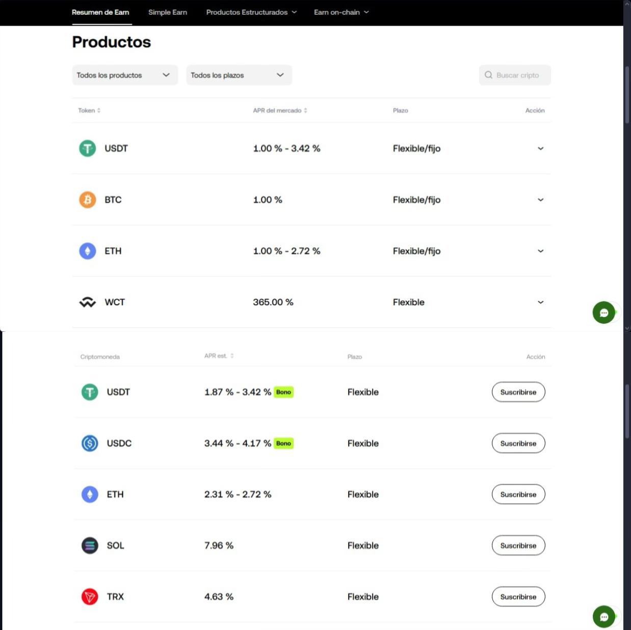 Este exchange ofrece distintos niveles de rentabilidad o modalidades para sus productos staking: staking bloqueado (a plazo fijo) y staking flexible y cada una de ellas ofrece distintos niveles de rentabilidad, liquidez y condiciones para el usuario.
