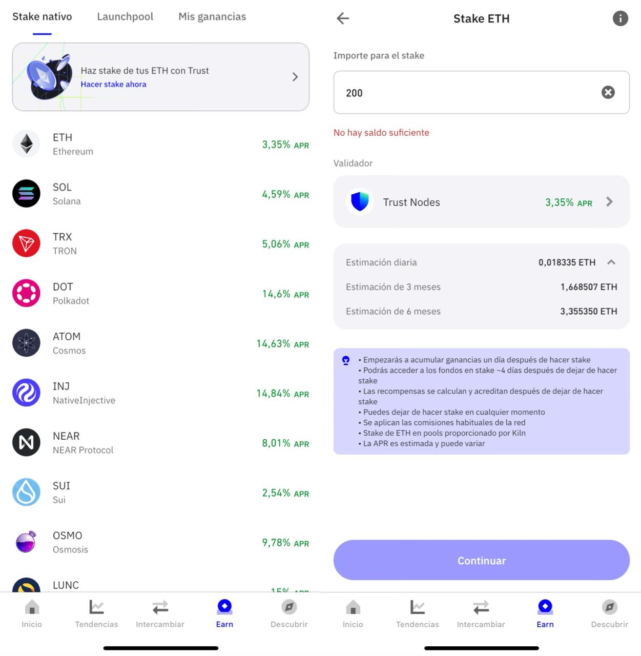 El rendimiento y la facilidad de retiro que ofrece Trust Wallet en sus funciones de staking está directamente ligado al protocolo de cada red y al validador seleccionado por el usuario. El APR depende del número de validadores activos, la inflación del token, el porcentaje de tokens delegados y la eficiencia del validador seleccionado. Por ejemplo, hacer staking de ATOM puede generar entre un 15% y un 20% APR, mientras que XTZ oscila entre el 5% y el 6%, y BNB ofrece rendimientos entre 3% y 6% APR.