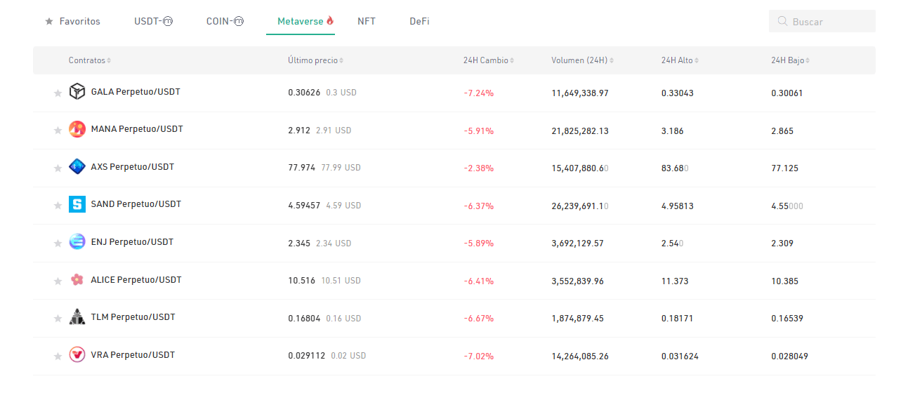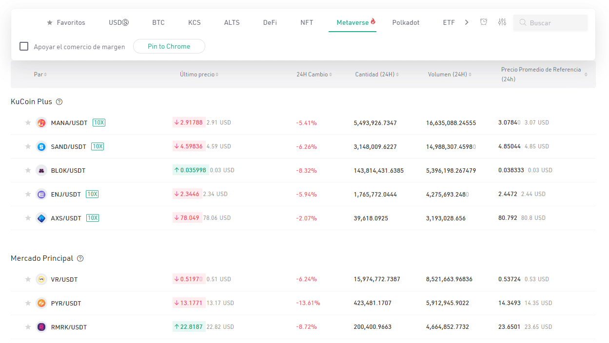 Algo curioso en este apartado, o mรกs bien de la organizaciรณn que KuCoin les da a los diferentes mercados, es que existe una secciรณn especial de pares de intercambio de los metaversos. Esto para unirse a la tendencia e interรฉs que se ha generado por estos universos virtuales, luego del anuncio del cambio de nombre de Facebook por Meta.