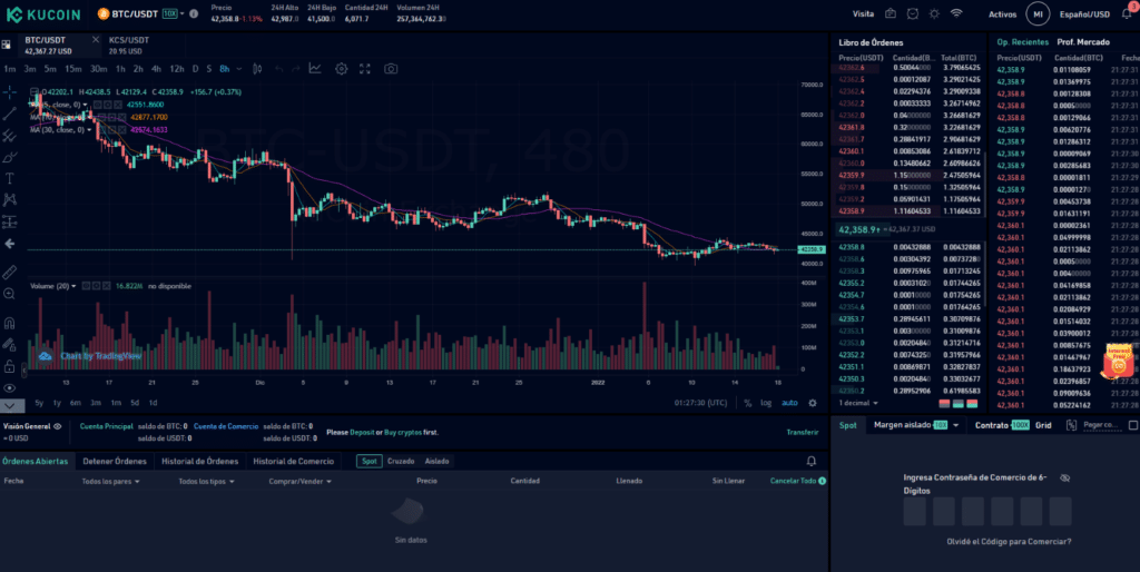 Su interfaz de trading es igual de sencilla y fรกcil de usar, al punto de poder decir que, si ya has utilizado otros exchanges, no existirรก ningรบn tipo de complicaciรณn ya que conserva el mismo estilo. Con respecto a sus grรกficas, estas son proporcionadas por TradingView.