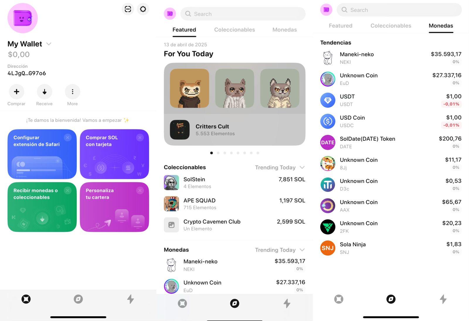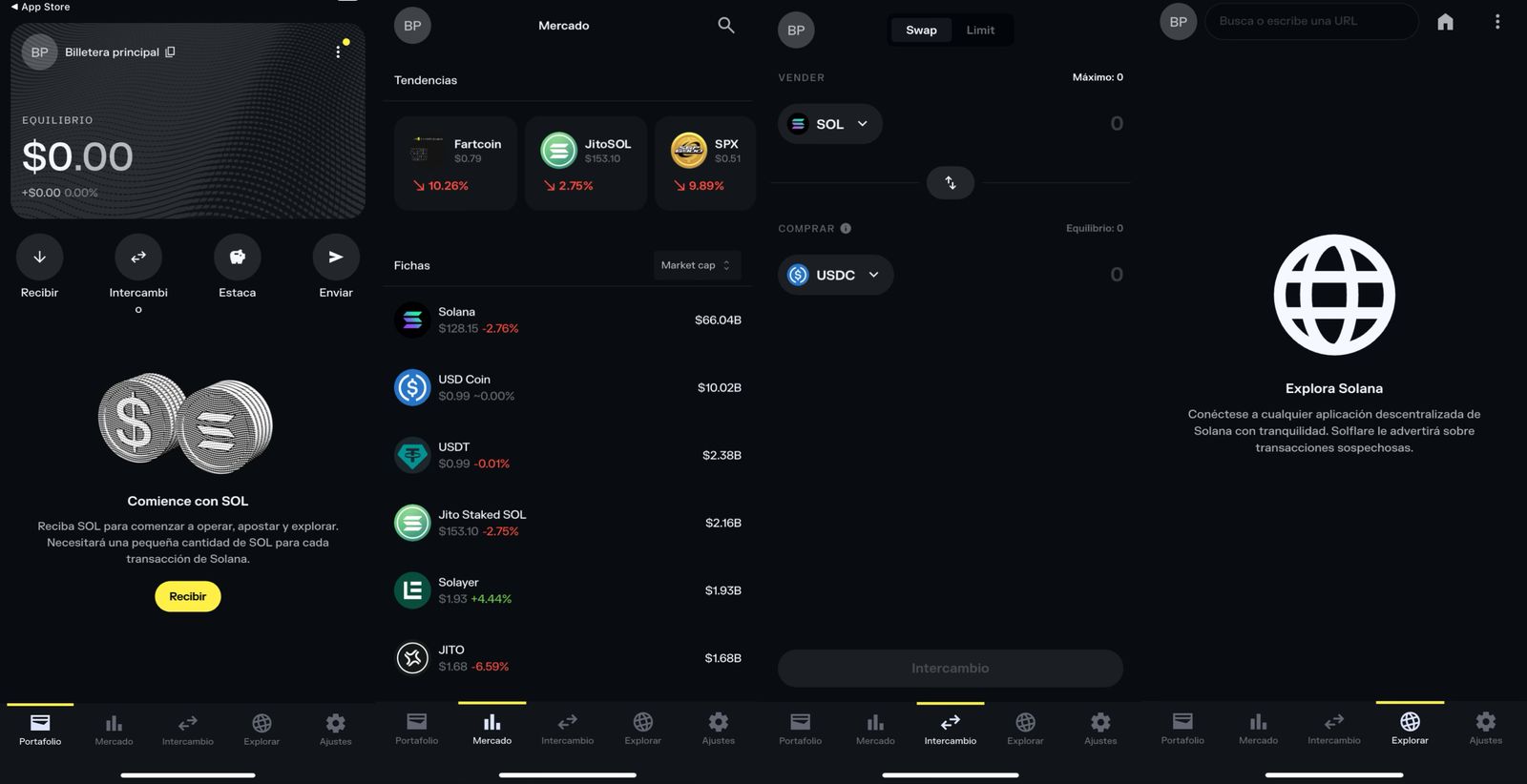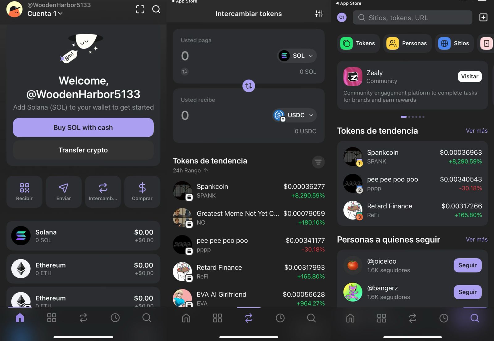 - Con Solana, permite almacenar y enviar tokens SPL, ademรกs de realizar staking directamente desde la app. Por otro lado, cuenta con navegador Web3 para conectar con dApps o plataformas DeFi como Jupiter, Raydium o Magic Eden.