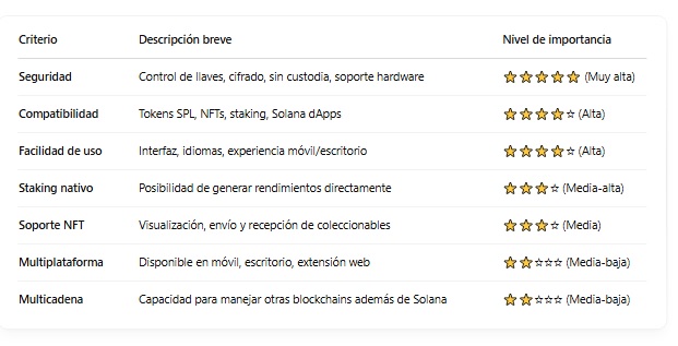 Wallets especializadas garantizan compatibilidad con tokens SPL, staking y dApps de la red.