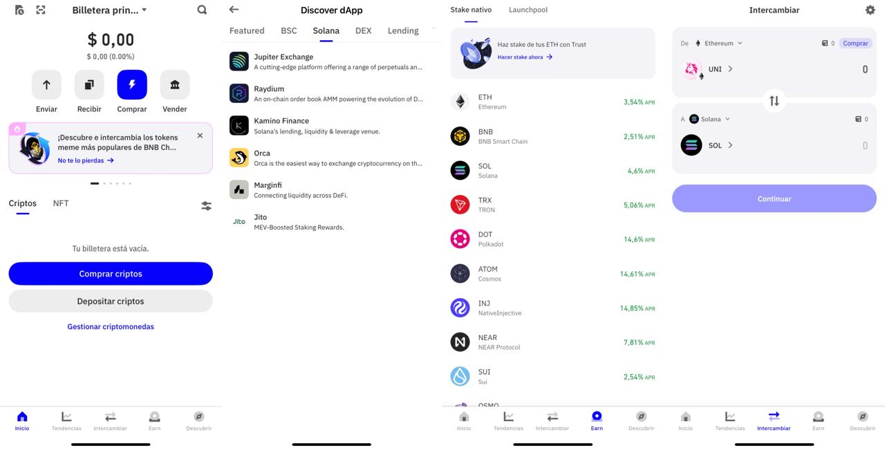 - Trust Wallet: tambiรฉn permite staking de SOL y otras criptomonedas desde el mรณvil.