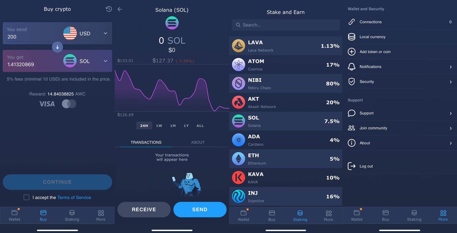 - Soporta tokens SPL y la moneda SOL. Permite staking nativo de SOL desde la misma aplicaciรณn y se puede interactuar con dApps de Solana desde su navegador Web3 o vรญa WalletConnect. Por otro lado, es compatible con Solana y es ideal para usuarios que buscan tener una sola wallet para mรบltiples redes, incluyendo Solana.ย