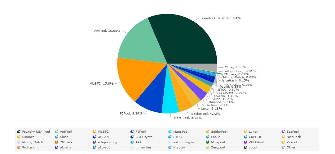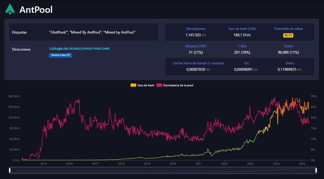 Al momento de la redacción de este artículo, su hash rate es el tercero más alto en el mercado con 123.68 EH/s, según MiningPoolStats. Y representa el 14.64 % del poder de cómputo total de toda la red de mineros.