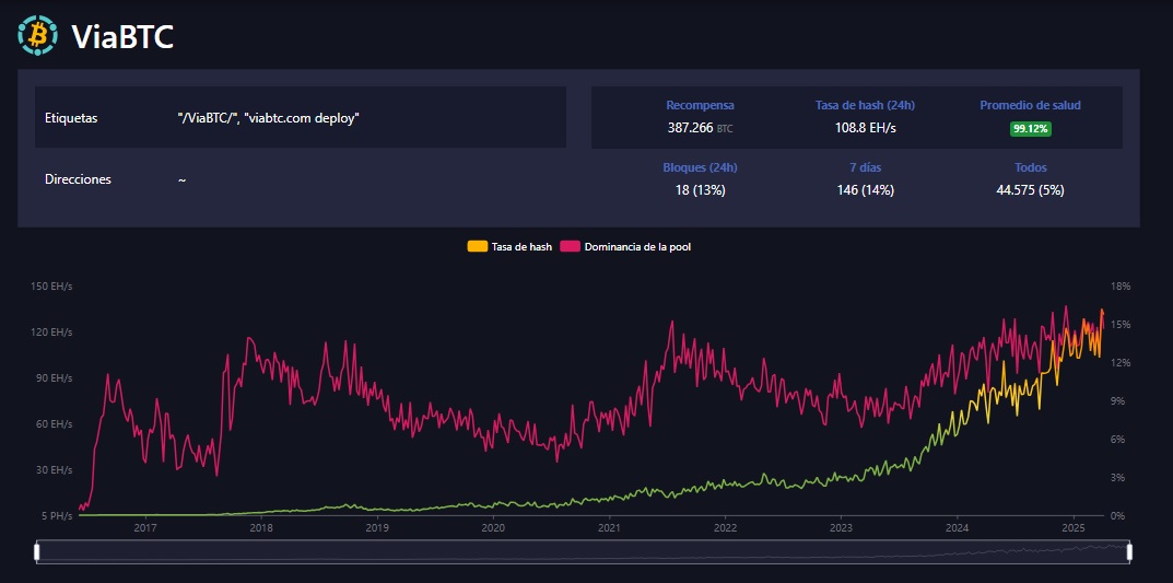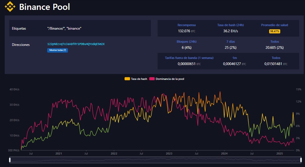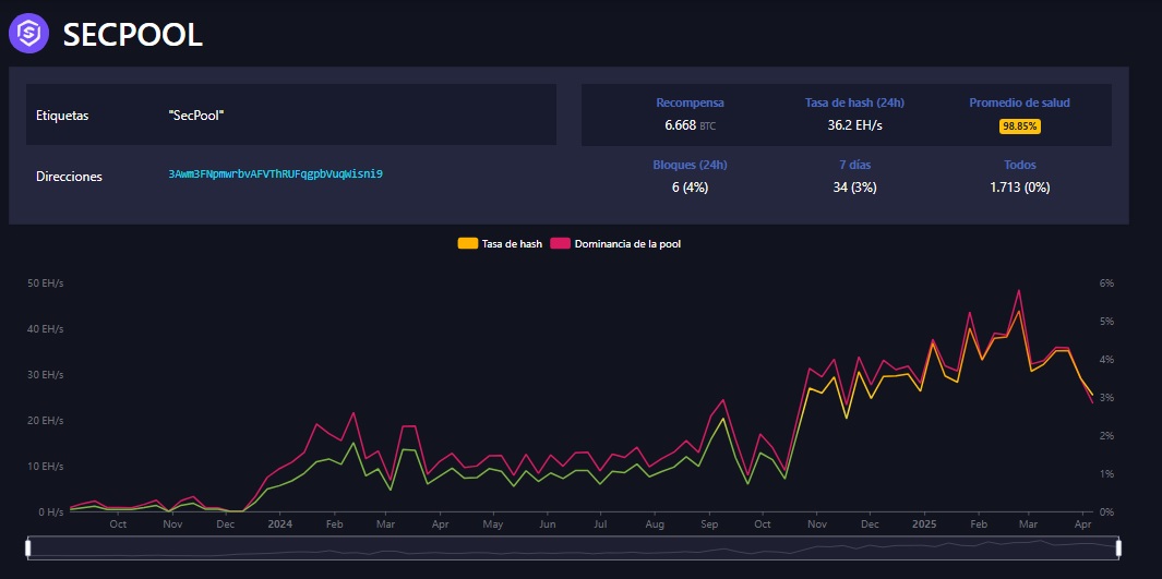 Al momento de la redacción de este artículo, su hash rate es de 32.48 EH/s, según MiningPoolStats y representa el 2.78 % del poder de cómputo total de toda la red de mineros.