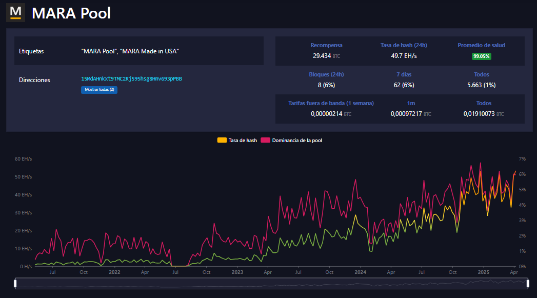 Mara Pool es un pool de minería operado por Marathon Digital Holdings (MARA), una de las compañías más influyentes en la minería de bitcoin a nivel corporativo, la moneda en la cual se especializa exclusivamente y la cual opera exclusivamente en Texas, Estados Unidos.