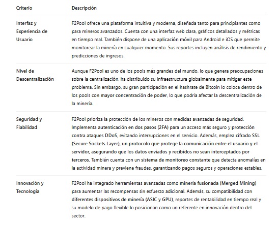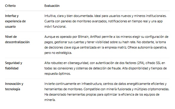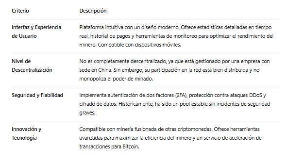 Su infraestructura global ubicada en Asia, Europa y América y su compatibilidad con diversos algoritmos lo convierten en una alternativa atractiva para mineros individuales y operaciones a gran escala. Sin embargo, uno de sus puntos débiles es que su modelo de operación es centralizado, lo que implica que los mineros deben confiar en la administración del pool para la distribución de recompensas. Es decir, los mineros no usan su propio nodo ni validan bloques, todo depende del operador a diferencia de por ejemplo, Ocean y CK Pool que dan mayor autonomía al minero.