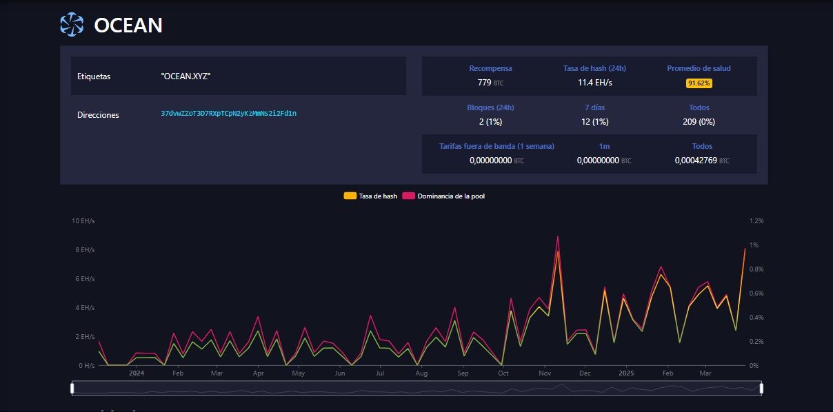 Ocean es un pool relativamente nuevo, creado a finales del 2023 con la finalidad de cambiar la forma en que los mineros participan en la red, describiéndose como “un nuevo tipo de pool de minería con la misión de descentralizar radicalmente la minería de bitcoin», que es la única moneda que mina.