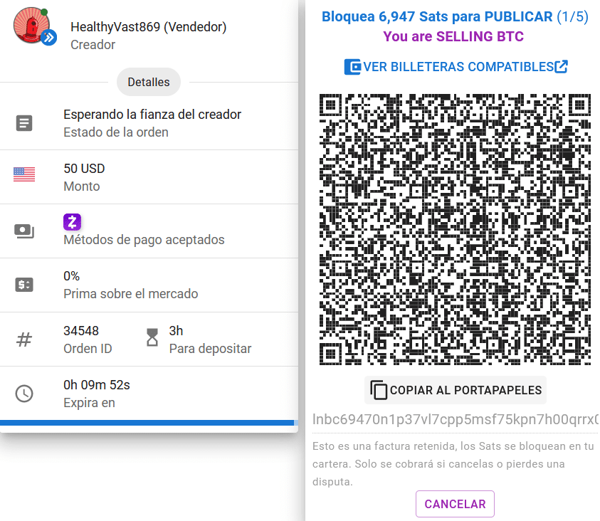 El exchange funciona como la plataforma de software de escritorio Bisq a la hora de comerciar con otro par: exige un depรณsito de seguridad, o como se dice en la jerga de RoboSats, un โbono de fidelidadโ.