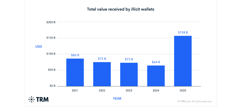 Según ese reporte, los flujos ilícitos con criptoactivos alcanzaron un valor récord de USD 158.000 millones durante 2025, lo que implicó un aumento del 145% frente al 2024, revirtiendo una tendencia de descenso observada en años anteriores.