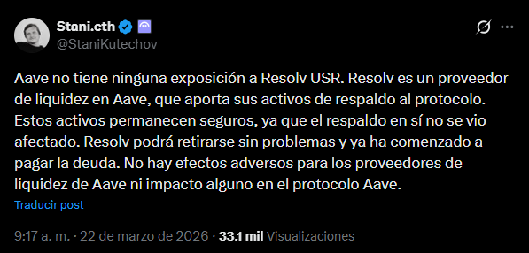 Por los momentos, ni Curve, ni Uniswap se han pronunciado respecto al ataque. Por su parte, Stani Kulechov, fundador de Aave, declaró a través de X que su plataforma no había sido afectada.