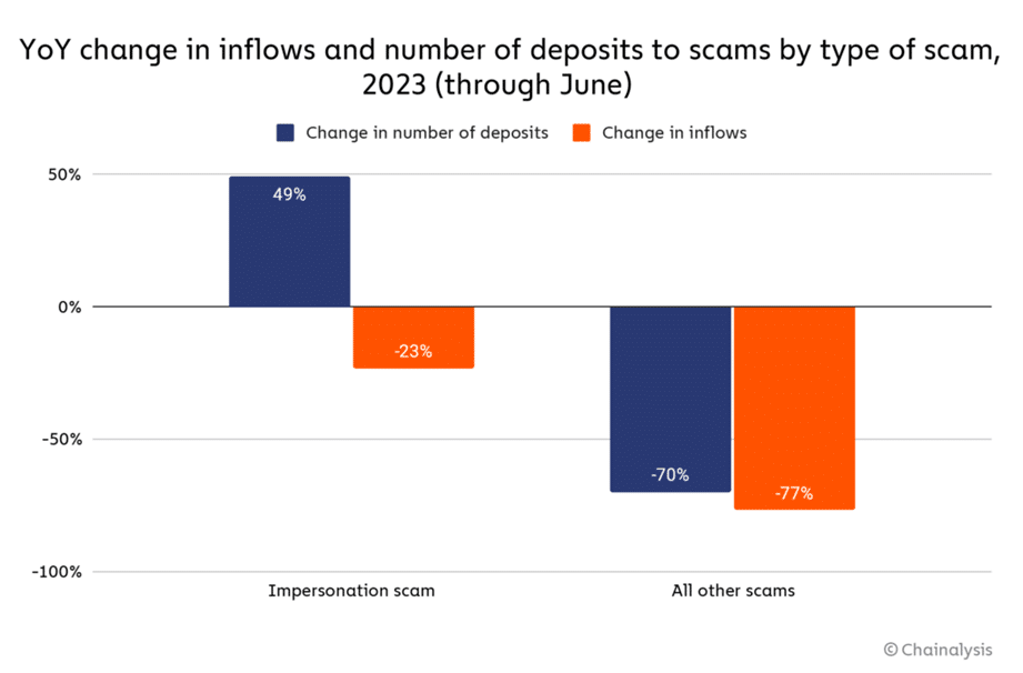 Esto sugiere que más personas han sido víctimas de estafas de suplantación en 2023, dice Chainalysis. “Incluso si la cantidad total perdida es menor”, agregó.