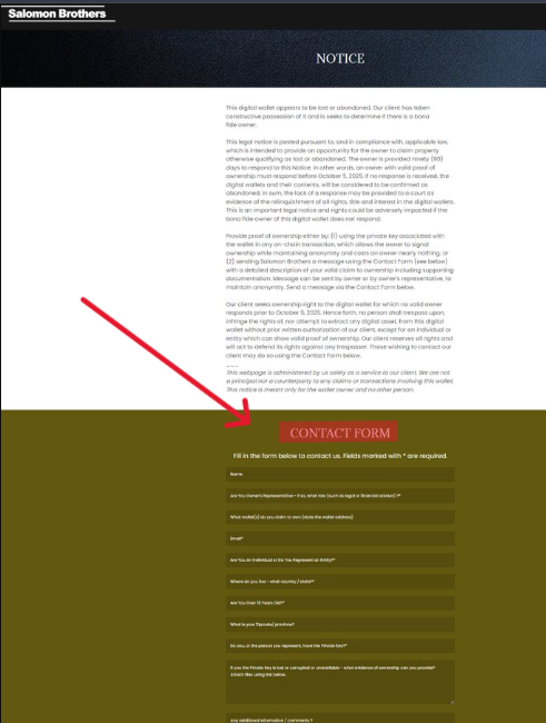 “Esta billetera digital parece estar inactiva o abandonada. Nuestro cliente ha tomado posesión constructiva de la misma y busca determinar si existe un propietario legítimo. Este aviso legal se publica conforme a la legislación aplicable, con el fin de brindar una oportunidad al propietario para reclamar una propiedad que, de otro modo, calificaría como perdida o abandonada. Se otorgan noventa días al propietario para responder a este aviso; en otras palabras, un propietario con prueba válida de propiedad debe responder antes del 5 de octubre de 2025. Si no se recibe respuesta, las billeteras digitales y su contenido se considerarán confirmadas como abandonadas”.