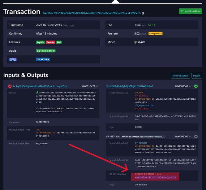 El modus operandi de esta estafa comienza con la creación de una transacción que incluye un output OP_RETURN con el texto «NOTICE TO OWNER: see www.salomonbros.com/owner_notice» (en castellano, AVISO AL DUEÑO: vea www.salomonbros.com/owner_notice).