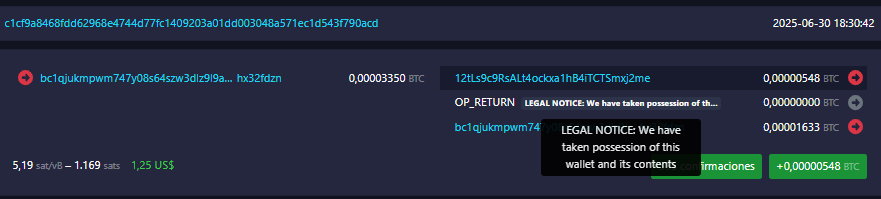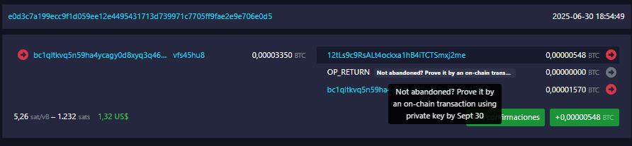 Posteriormente, se añaden otros mensajes en otras transacciones: «LEGAL NOTICE: We have taken possession of this wallet and its content» (AVISO LEGAL: Hemos tomado posesión de este monedero y su contenido) y «Not abandoned? Prove it by an on-chain transaction using private key by Sept 30» (¿Wallet no abandonada? Pruébelo con una transacción en la cadena usando la clave privada antes del 30 de septiembre):