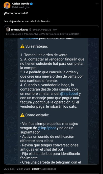 Adrián Treviño, un usuario de Bitcoin conocido en X como visionario_btc, denunció haber caído en una estafa mientras intentaba vender sus fondos en BTC a través de LNP2PBot. Este bot de Telegram permite intercambios peer-to-peer (P2P) en la Lightning Network de Bitcoin, sin necesidad de verificación de identidad (KYC). El caso, que Treviño compartió en un hilo detallado en la plataforma X, está generando una ola de advertencias en la comunidad que gira en torno a Bitcoin, especialmente en México, donde dice Treviño que interactúa.