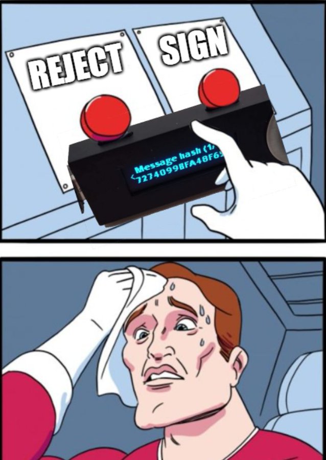 Para ejemplificarlo, Back posteó en sus redes sociales un meme que demuestra cómo la complejidad de la máquina virtual de Ethereum puede “filtrarse” hacia las hardware wallets durante los procesos de firma. Esto logra favorecer los procesos de firma ciega y desinformada.