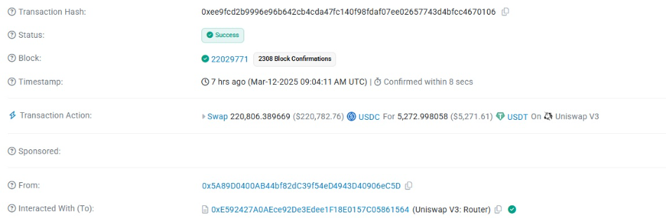Una transacción realizada en el protocolo V3 de Uniswap, el popular exchange descentralizado (DEX) basado en Ethereum (ETH), ha levantado sospechas en la comunidad. En ella, un usuario intentó intercambiar aproximadamente 221.000 dólares en USDC, una stablecoin vinculada al dólar, por el equivalente en USDT, otra moneda estable.