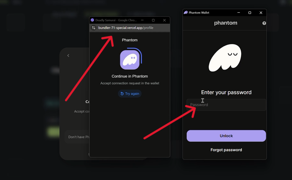 A la derecha, en paralelo, aparece la ventana auténtica de Phantom solicitando la contraseña, lo que permite al sitio fraudulento superponer su propia ventana emergente falsa y preparar la solicitud de firma maliciosa que puede derivar en el drenaje de la wallet.