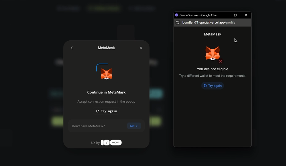 En lugar de activar la extensión real del monedero, el sitio abre una nueva ventana del navegador que suplanta visualmente a wallets populares como MetaMask o Phantom. Esta ventana falsa muestra una dirección web y una interfaz casi idéntica a la original, generando una sensación de legitimidad.