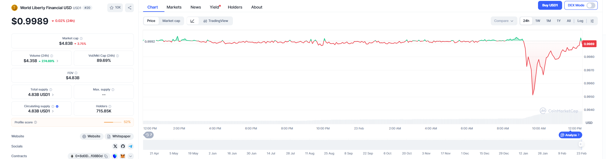 En CoinMarketCap se puede apreciar una pequeรฑa pรฉrdida de paridad cayendo hasta loas 0,9950 dรณlares ocurrido a las 9:30 de la maรฑana, hora Venezuela. No obstante, se podrรญa considerar una caรญda bastante pequeรฑa si se compara con eventos similares sufridos por otras stablecoins, como es el caso de USX, que en diciembre pasado perdiรณ paridad hasta los 0,92 dรณlares.