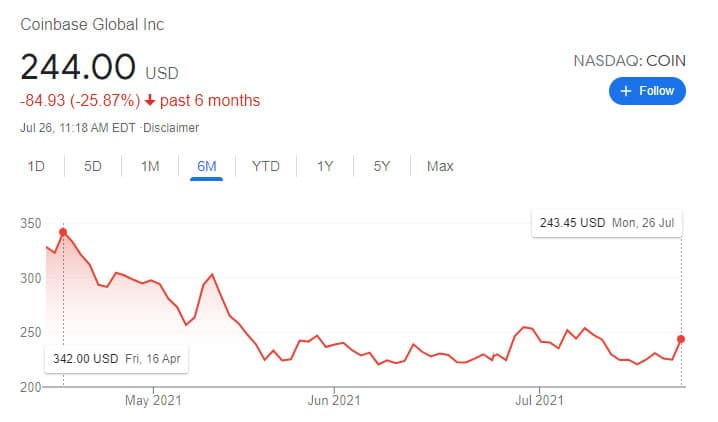 La acción de Coinbase se cotizó en USD 324 el día de su inicio en Nasdaq, el 14 de abril pasado, y dos días después alcanzó su máximo valor de USD 342. La acción se ha depreciado 25,87% en un poco más de tres meses, como se aprecia en el gráfico anterior, y se cotiza en USD 243,45.