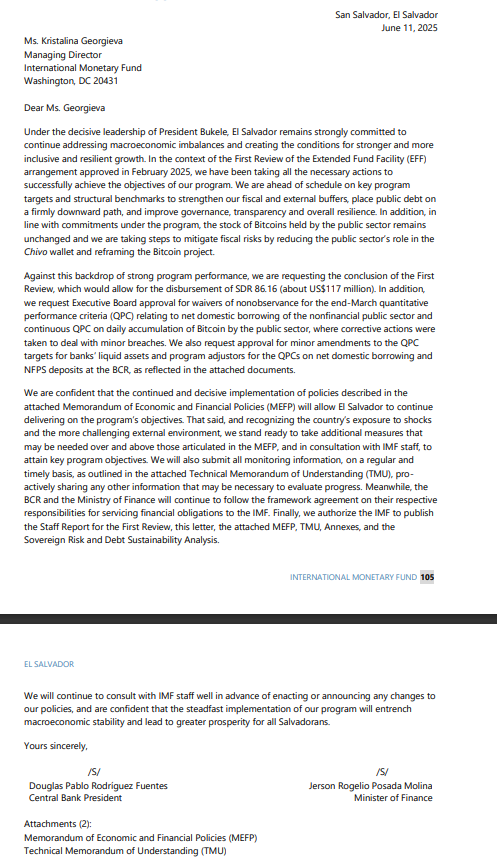 Esta declaración refuerza lo revelado en un informe de cumplimiento del FMI publicado el 15 de julio, que incluye una carta firmada por el presidente del Banco Central de Reserva de El Salvador, Douglas Rodríguez, y el ministro de Hacienda, Jerson Posada.
