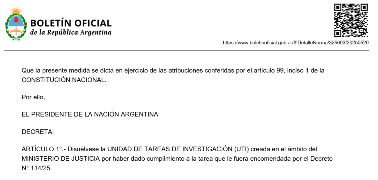 En el Decreto 335/2025, publicado por la Presidencia de Argentina el 19 de mayo, el gobierno de Javier Milei ordenó la disolución de la UTI (Unidad de Tareas de Investigación), el organismo que había creado en febrero para investigarse a sí mismo tras el lanzamiento del token LIBRA.