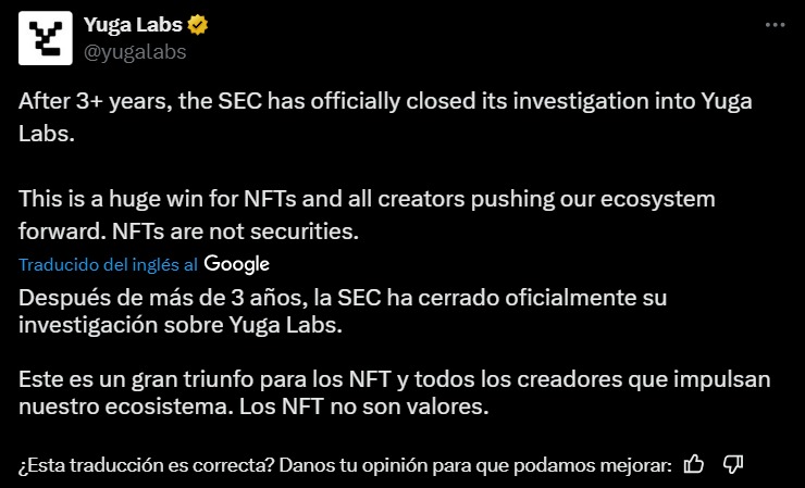 Por su parte, el equipo de Yuga Labs tambiรฉn tiene razones para festejar. A travรฉs de un post en X, anunciaron que, tras mรกs de tres aรฑos, la SEC ha decidido cerrar oficialmente el caso en su contra. En 2022, bajo el liderazgo del controvertido Gary Gensler, el organismo argumentaba que los NFT debรญan considerarse valores segรบn la legislaciรณn estadounidense. Sin embargo, con el cierre de esta investigaciรณn, la nueva administraciรณn marca un precedente al no clasificar los NFT de esta forma.