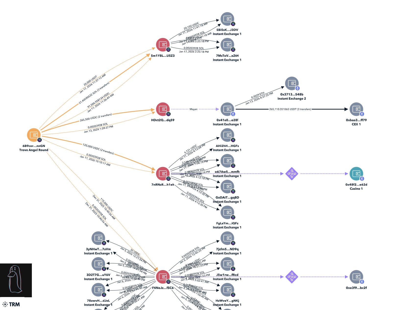 La presión sobre el equipo de Trove Markets aumentó cuando investigadores reconocidos en el área de la seguridad de activos digitales intervinieron. ZachXBT cuestionó una transferencia de 45.000 dólares de la ronda ángel de Trove a una dirección vinculada a un depósito de casino, y pidió al equipo que explicara la transacción.