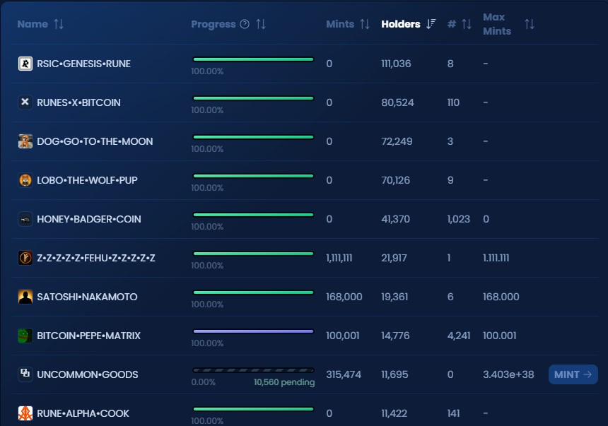 La mayor parte de la actividad de Runes recae en una decena de tokens, que reúnen más de 450.000 usuarios. En este sentido, destacan proyectos como RSIC (111 mil holders), RUNES X (80.000 holders), DOG (72 mil holers), LOBO (70.000 holders), HONEY BADGER (41 mil holders) y Z.Z.Z.ZZ (21 mil holders). Todos estos tokens fueron emitidos luego del halving.